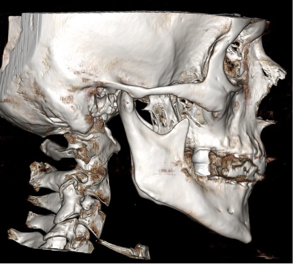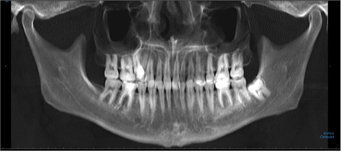 Для более полного понимания клинической ситуации нам надо КТ. По КТ мы сможем оценить состояние корней, скрытые кариесы и прочие важные для зубов данные. Но из него же мы получаем информацию о скелетном профиле пациента для дальнейшего планирования лечения и состояние ВНЧС, верхних дыхательных путей, скелетные размеры челюсти, состояние пазух и многое другое, что позволяет полностью, шаг за шагом заполнить первый блок протокола. При осмотре пациента, по его внутриротовым фотографиям и КТ оцениваем состояние твёрдых тканей зубов, периодонта и пародонта. Назначаем соответствующее лечение.