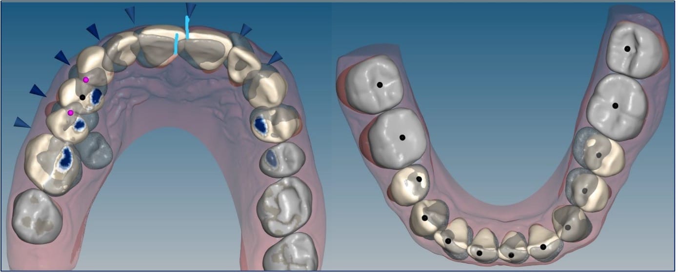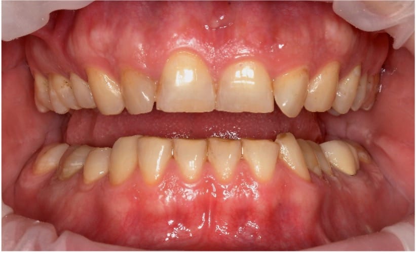 Уже на основании внутриротовых фотографий можно предположить наличие у пациента дистального глубокого прикуса, сужения верхней и нижней челюстей, скученности зубов, гиперпрорезывания резцов, тортаномалий, а также выраженной стираемости твердых тканей зубов.