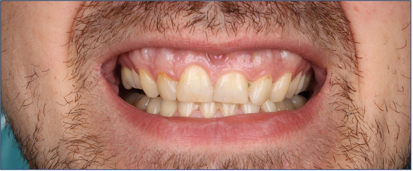 В клинику обратился пациент, мужчина 34 лет, с жалобами на бруксизм, выраженную стираемость зубов, невозможность найти комфортное положение нижней челюсти при смыкании зубных рядов, спазмы в области шеи, повышенную чувствительность зубов, а также застревание пищи в межзубных промежутках.